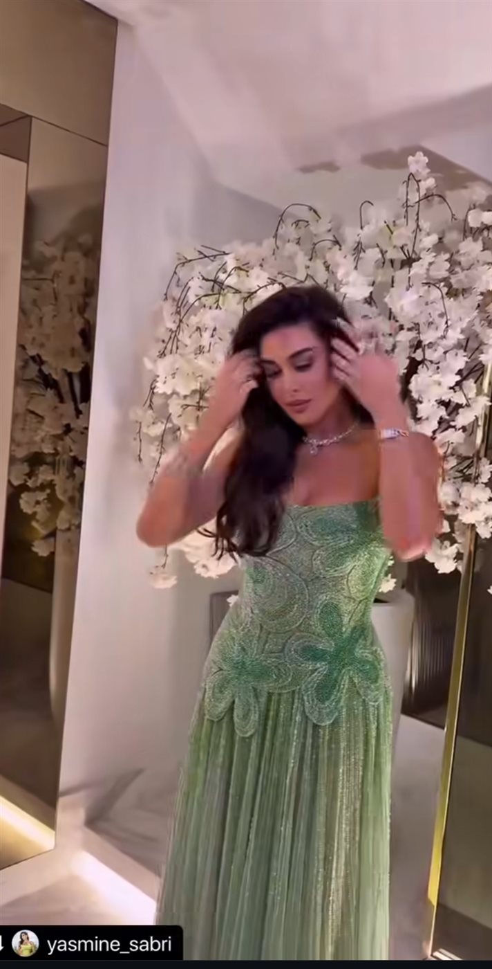 ارتدت النجمة ياسمين صبري فستان طويلاً أخضر اللون غني بالنقاشات الرومانسية ومنسدلاً بقصة البليسيه اللامع من الأسفل حمل توقيع مصمم الأزياء اللبناني جان بيار خوري، حيث أن ياسمين صبري دائمًا تتعاون مع هذا المصمم في أغلب إطلالاتها التي تحمل توقيعه.